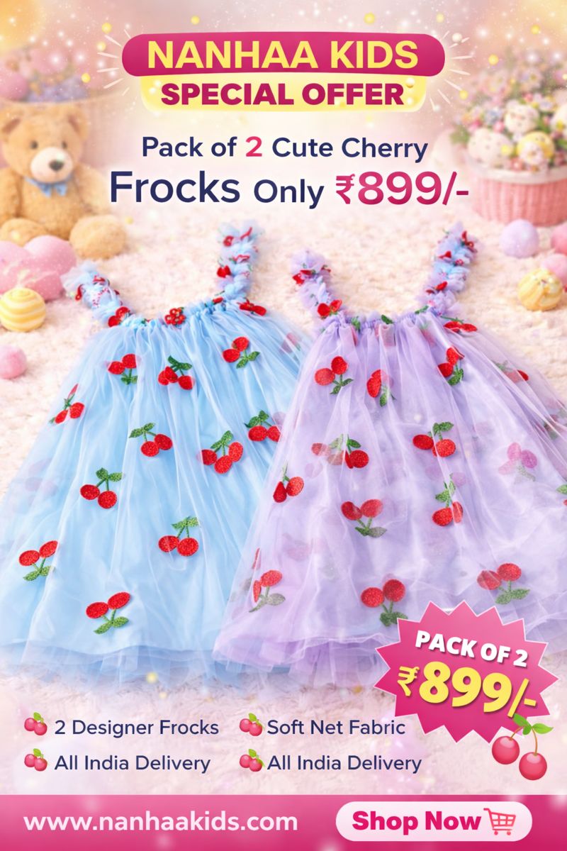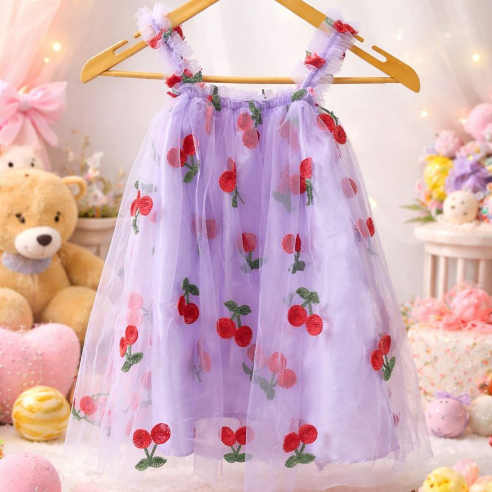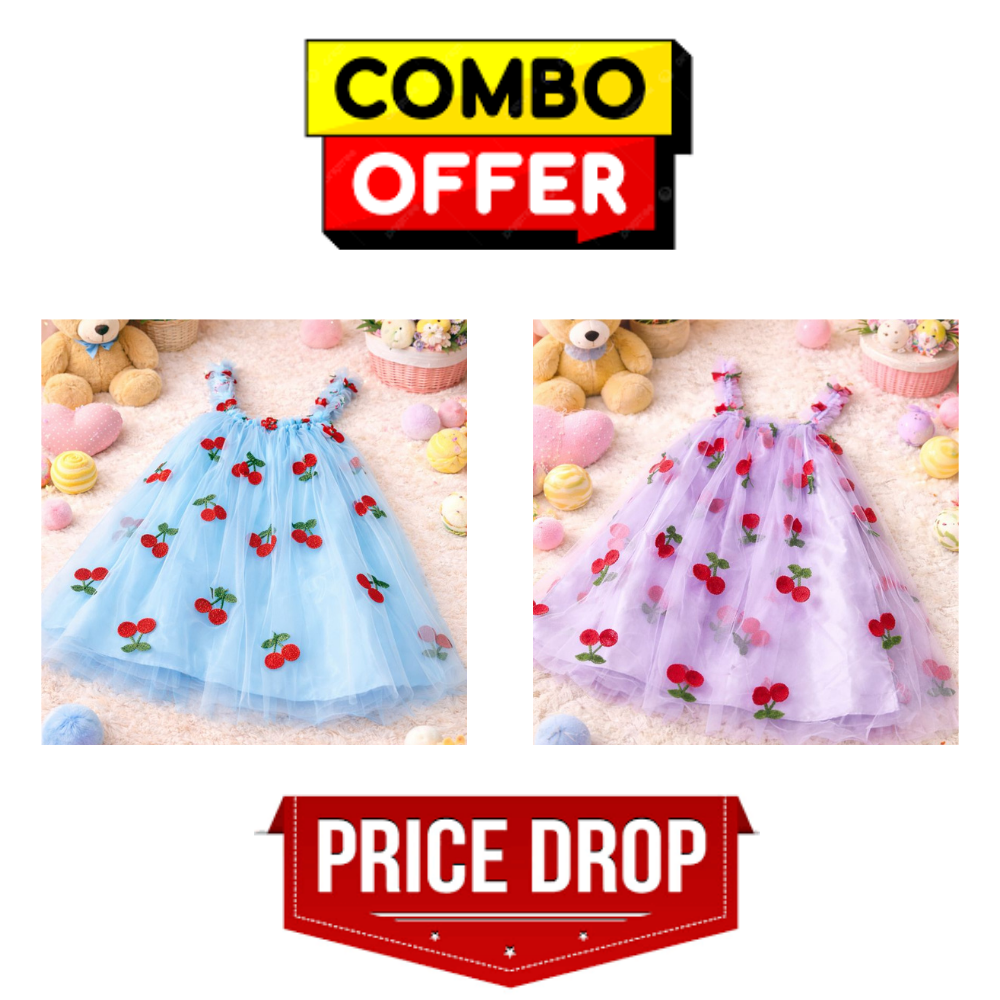 This beautifully designed Pack of 2 frocks is made for parents who want style, comfort, and value together. Soft net fabric, cute cherry embroidery, and princess-style flare make it a perfect choice for every special moment.